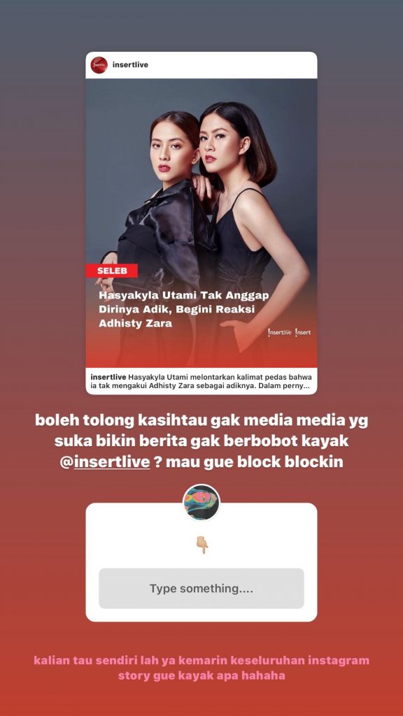 “Boleh tolong kasihtau gk media-media yg suka bikin berita nggak berbobot kayak @insertlive? Mau gue block blockin. Kalian tahu sendirilah ya kemarin keseluruhan instagram story gue kayak apa hahaha.”