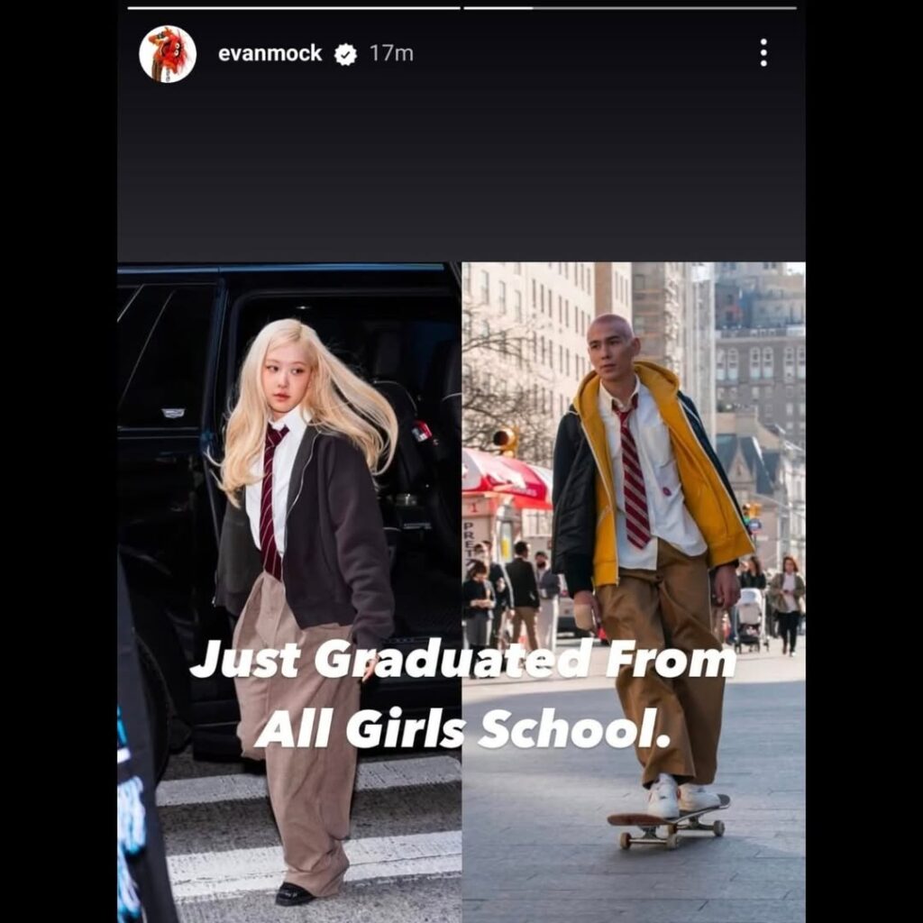 Evan posting foto dirinya dengan Rose pake editan yang kebetulan pake outfit yang sama dengan caption “just graduated from all girls school. (baru saja lulus dari sekolah khusus perempuan)”