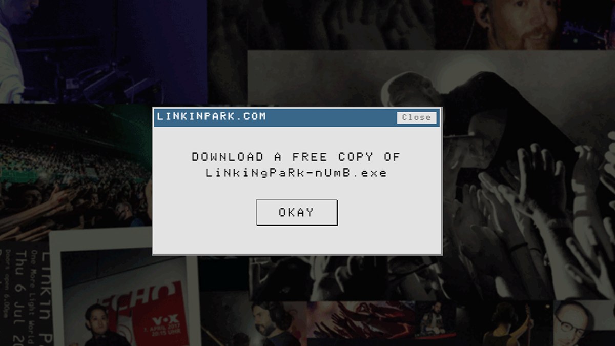 Kiss FM Medan – Fans Linkin Park dikejutkan dengan munculnya window dengan gaya microsoft Windows tahun 1998 yang menyuruh pengguna untuk mengunduh file bernama “LiNkiNgPaRk-nUmB.exe” ketika membuka official website linkinpark.com. Terlihat seperti sebuah trojan virus dan sangat mencurigakan, tapi kalau pengguna menolak untuk mengunduh, window ini akan semakin banyak muncul.