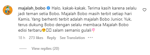“Halo, kakak-kakak. Terima kasih karena selalu jadi teman setia Bobo. Majalah Bobo masih terbit setiap hari Kamis. Yang berhenti terbit adalah majalah Bobo Junior. Yuk, terus dukung Bobo dengan selalu membaca Majalah Bobo edisi terbaru😍🙏🏻 salam semanis gulali🍭“
