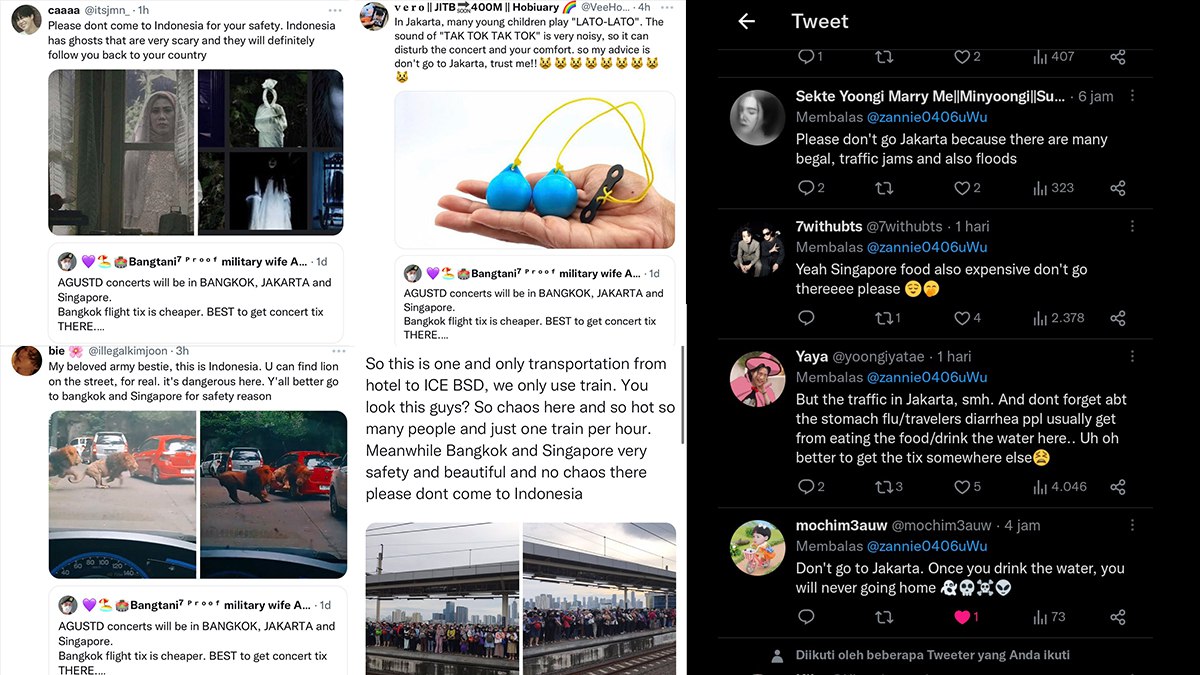 Mulai yang nakut-nakutin kalau di Indo itu bisa ketemu Singa di jalan. Terus nakut-nakutin bakal ada banyak hantu lokal yang nggak kalah populer di negeri Jiran karena keseramannya bakal menghantui selama di Indonesia. Ngatain Indonesia transportasinya nggak asik, sampai nakutin kalau air Indonesia bikin fans luar negeri malah jadi nggak bisa balik sama sekali.